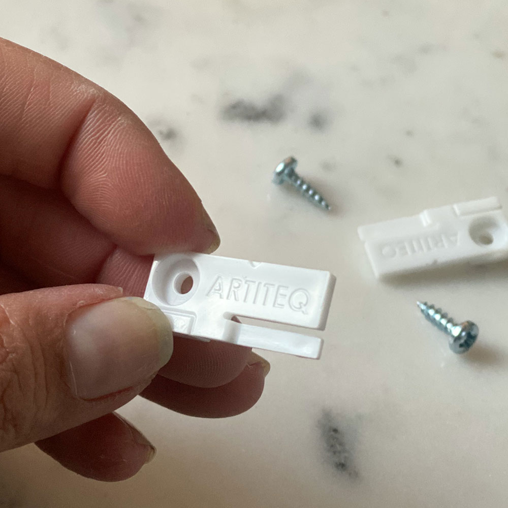 To offer a solution, Artiteq has introduced the Tilt Reducer. This ingenious device ensures that frames and artwork hung on a picture hanging system remain more stable and do less tilt forward, allowing your artwork to sit flatter against the wall. The Tilt Reducer is easily affixed to the top of a wooden frame, either individually or as a pair, aligned with the hanging point of the hook or hooks. It performs best on frames with a backing that is at least 10mm high and a thickness of 12mm or more. By attaching the Tilt Reducer to the top of the frame, it gently draws the top closer to the wall, enhancing stability. The Tilt Reducer is compatible with both 1mm and 2mm thick hanging wires, which can be perfectly aligned thanks to various groove marks.