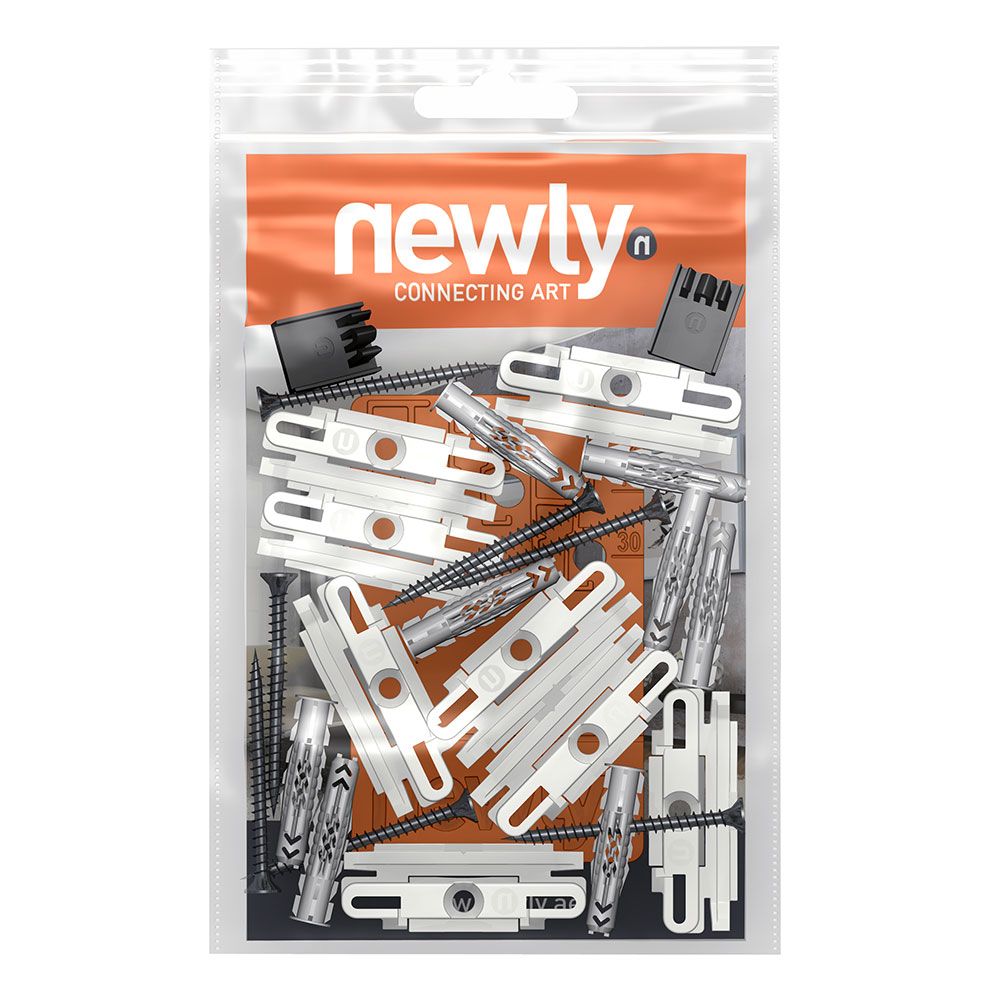 1 x 1103.200 Newly R10 Black aluminium rail 200cm long & 4040.212 Newly R10 Black Installation Kit with 2 end caps, a drilling template and 6 clips, screws, and anchors needed for attaching it to the wall.