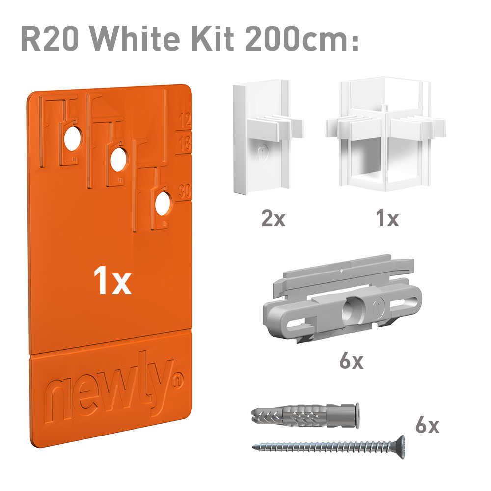 1 x 1201.200 Newly R20 White aluminium rail measuring 200cm & 4040.220 Newly R20 White Installation Kit with 2 end caps, 1 corner connector, a drilling template and 6 clips, screws, and anchors needed for attaching it to the wall.