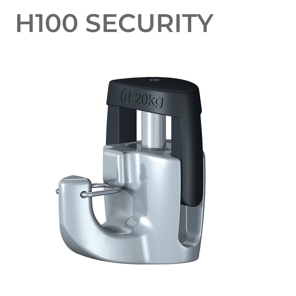Meet the H100 Security Hook, your ultimate partner for displaying art with confidence. This cutting-edge auto grip hook features a self-clamping mechanism that ensures a secure hold for your beloved artworks and frames. The additional spring clip protects the frame from accidental unhooking and enhances theft deterrence. Designed to work flawlessly with 2mm perlon cords and steel wires, this innovative hook increases clamping force for heavier loads, making it perfect for pieces weighing up to 20 kg. For larger displays exceeding 24 inches (60cm), we recommend using two cords and two hooks, effectively boosting the maximum load capacity to an impressive 40 kg.